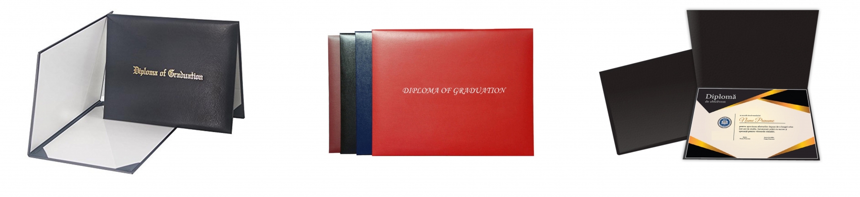 Mapa pentru diploma este un accesoriu care nu ar trebui sa lipseasca in ziua festivitatii. Realizata din materiale de calitate, protejeaza diploma si ajuta la o pastrare mai buna a acesteia. Se poate comanda in diferite variante de culori: negru, visiniu, verde, albastru, rosu. Pretul include personalizarea copertii.
